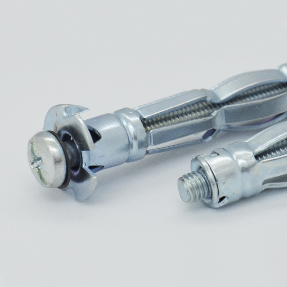 Дюбель молли очень хорошо конструктивно продуман. Он выполнен в виде металлического полого стержня, внизу имеется распорная часть, которая при монтаже очень широко раскрывается, образуя конструкцию по строению напоминающую зонт. На нижней стороне широкой шляпки расположены два шипа. В центр вставлен винт или винт-костыль, винт-кольцо, винт-полукольцо при помощи которого и происходит монтаж. с их помощью осуществляют крепеж в материал с пустотами, такой как гипсокартон или фанера. Крепят с помощью дюбелей молли, в основном, нетяжелые конструкции - светильники, картины и прочие.