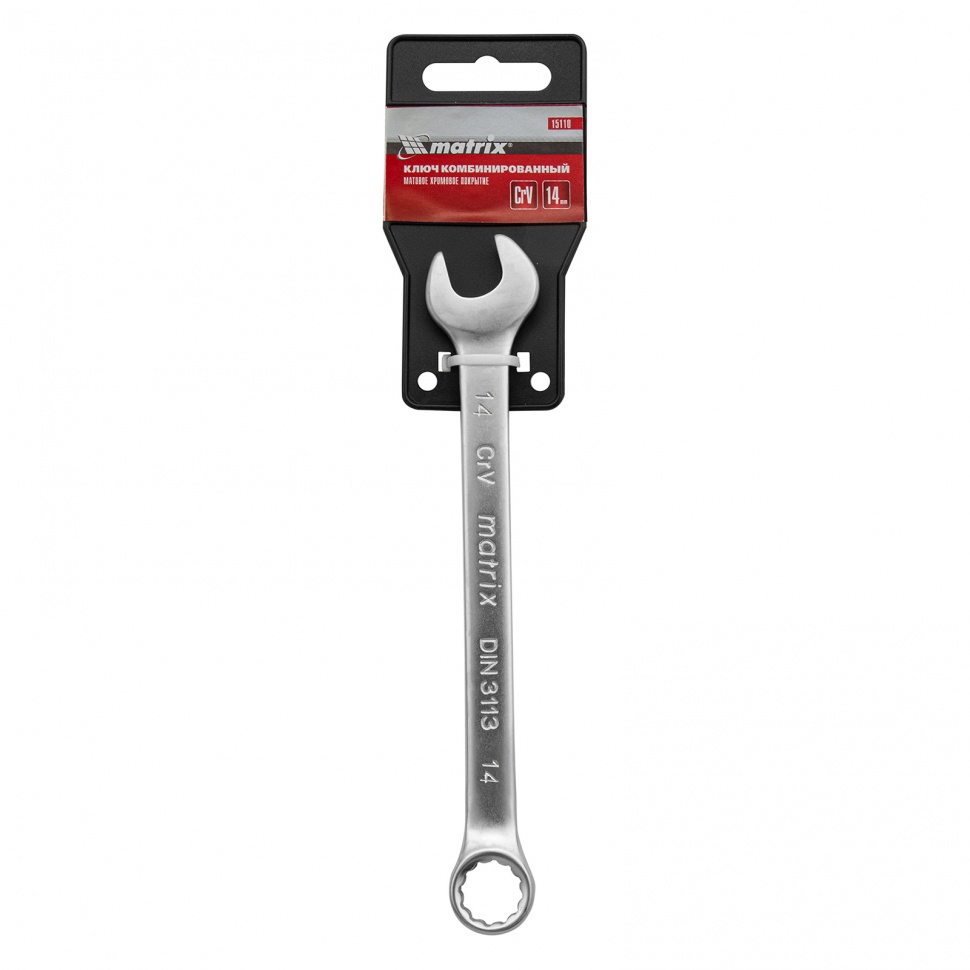 Ключ комбинированный Matrix 15110 из стали CrV, 14 мм, с покрытием «матовый хром», пригодится при проведении ремонтных работ дома или в гараже. С его помощью можно осуществлять быстрый монтаж и демонтаж крепежных элементов. Кольцевой зев обеспечивает удобство работы благодаря углу наклона 15 градусов относительно плоскости инструмента.ПреимуществаКлюч из хромованадиевой стали обладает необходимыми прочностными характеристиками и высокой сопротивляемостью деформации.Рабочая часть ключа прошла закалку до твердости 45 HRC в соответствии с требованиями ГОСТа.Матовое хромовое покрытие защищает ключ от образования коррозии.Накидные части с 12-гранным профилем позволяют охватить крепеж по всей поверхности, за счет чего снижается риск деформации его граней.Ключ удобно хранить и он не потеряется во время транспортировки, т.к. упакован в пластиковый держатель.