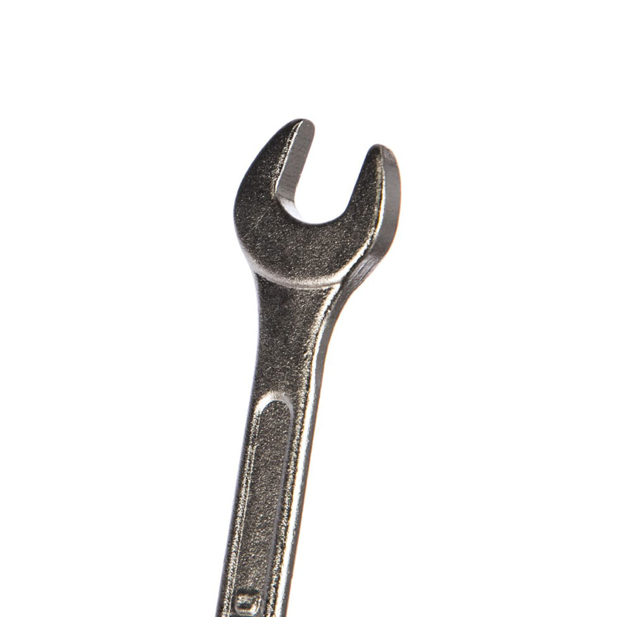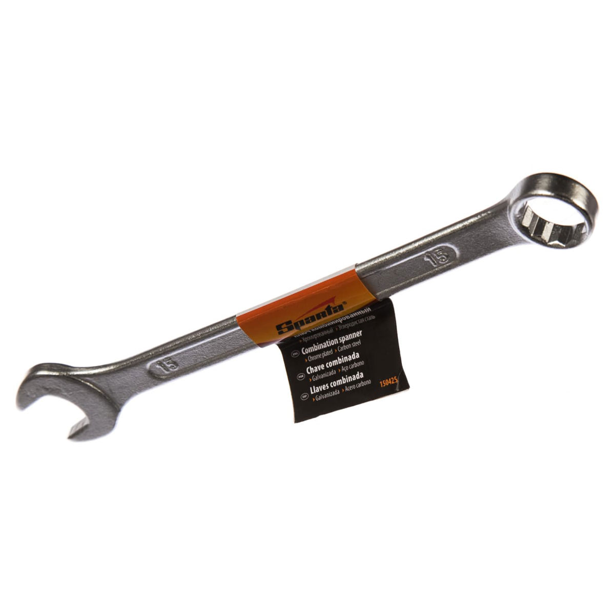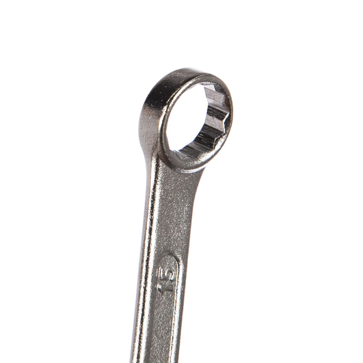Комбинированный ключ Sparta 150425, 15 мм, хромированный — слесарно-монтажный инструмент для работы с резьбовыми соединениями. 12-гранная накидная головка обеспечивает надежный контакт с поверхностью крепежа, а рожковый зев дает возможность работать там, где применение кольцевого затруднено. Ключ пригодится в мастерской, гараже, будет полезен во время строительства и ремонта.ПреимуществаКлюч изготовлен из углеродистой стали марки 45, чем обеспечивается его прочность и хороший ресурс.Твердость рабочих частей ключа составляет 42 HRC, это соответствует требованиям ГОСТ.Хромированная поверхность не подвержена коррозии, что продлевает срок службы инструмента.Кольцевая головка смещена на 15 градусов относительно плоскости ключа, это облегчает монтаж в труднодоступных местах.