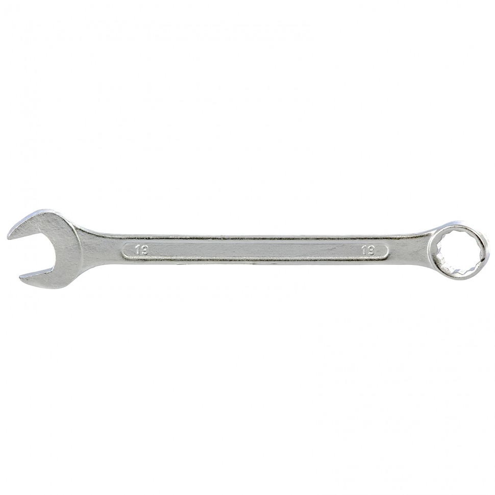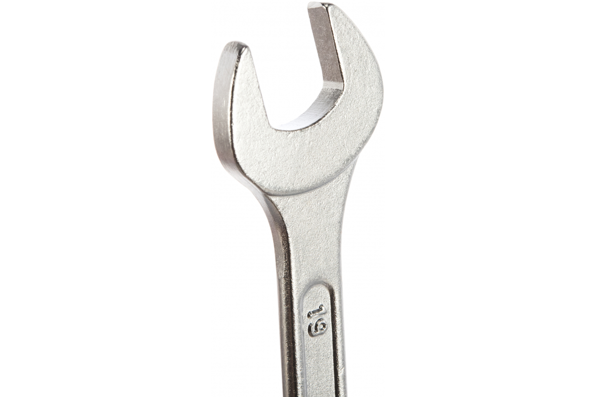Комбинированный ключ Sparta 150465, 19 мм, хромированный — слесарно-монтажный инструмент для работы с резьбовыми соединениями. 12-гранная накидная головка обеспечивает надежный контакт с поверхностью крепежа, а рожковый зев дает возможность работать там, где применение кольцевого затруднено. Ключ пригодится в мастерской, гараже, будет полезен во время строительства и ремонта.ПреимуществаКлюч изготовлен из углеродистой стали марки 45, чем обеспечивается его прочность и хороший ресурс.Твердость рабочих частей ключа составляет 42 HRC, это соответствует требованиям ГОСТ.Хромированная поверхность не подвержена коррозии, что продлевает срок службы инструмента.Кольцевая головка смещена на 15 градусов относительно плоскости ключа, это облегчает монтаж в труднодоступных местах.