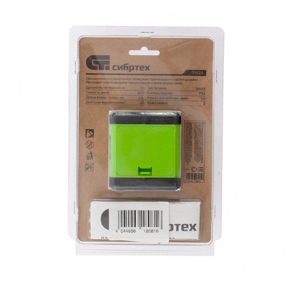 Линейный лазерный уровень Сибртех ЛН 02 подходит для отделки стен, кладки плитки, монтажа выключателей, установки полок и других работ в закрытых помещениях, Он проецирует красный луч в вертикальной и горизонтальной плоскостях, Дальность построения сос