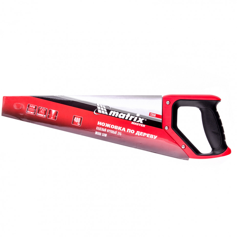 Ножовка по дереву Matrix 23556 с полотном длиной 400 мм, с крупными калеными зубьями с шагом 5-6 TPI и 2D-заточкой, с двухкомпонентной рукояткой, используется для быстрой продольной или поперечной распиловки древесины. Высокая скорость работы достигается благодаря крупным зубьям с волновой заточкой и универсальным шагом 4-5 мм. Двухгранная заточка зубьев дает возможность пилить в направлении как от себя, так и на себя, а также перетачивать режущую кромку при необходимости. Ножовка подходит для выполнения плотницких и хозяйственных работ.ПреимуществаПолотно обладает высокой механической прочностью, поскольку изготовлено из пружинной стали 65Mn.Рабочая кромка долго сохраняет режущие свойства благодаря закаленным зубьям.Инструмент устойчив к коррозии, т.к. его полотно покрыто защитным лаком.Работа с ножовкой комфортна, поскольку эргономичная рукоятка с рельефной поверхностью не скользит в руке.Высокое качество ножовки подтверждено производителем, осуществляющим постоянный технологический контроль на всех этапах