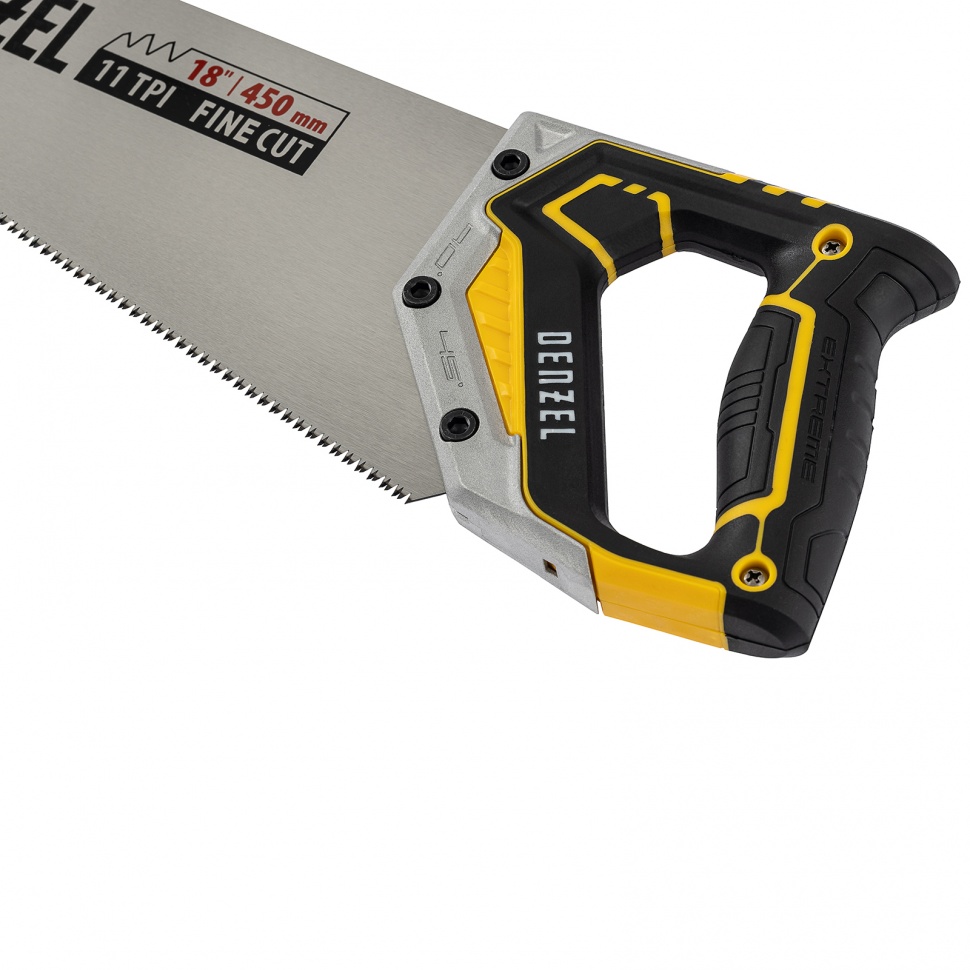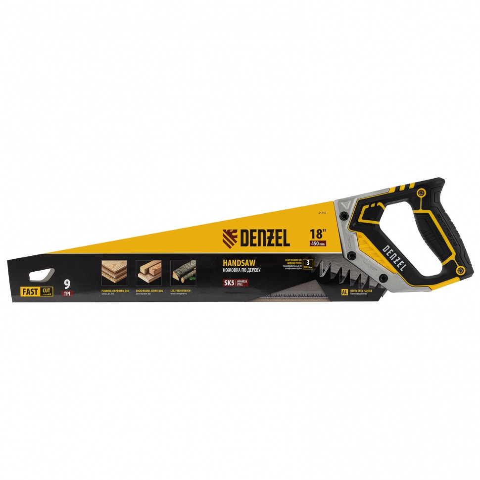 Ножовка по дереву DENZEL предназначена для столярных работ- распиловка заготовок из древесины, ДСП и OSB. Может производить продольный и поперечный распил. Ножовка обладает высокой производительностью благодаря агрессивной трехгранной, многоступенчатой заточке зубьев, которая обеспечивает идеальную геометрию и высокую остроту зуба.Преимущества:Пильное полотно изготовленное из японской стали SK-5 с шагом зуба 9TPI, позволяет выполнять более быстрый рез.Закалка ТВЧ обеспечивает дополнительную твердость зуба 55-58 HRC.Благодаря эргономичной форме и рифленой поверхности, металлопластиковая обрезиненная рукоятка удобно ложится в руку и не скользит, обеспечивая комфорт во время интенсивной работы.