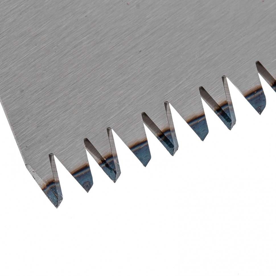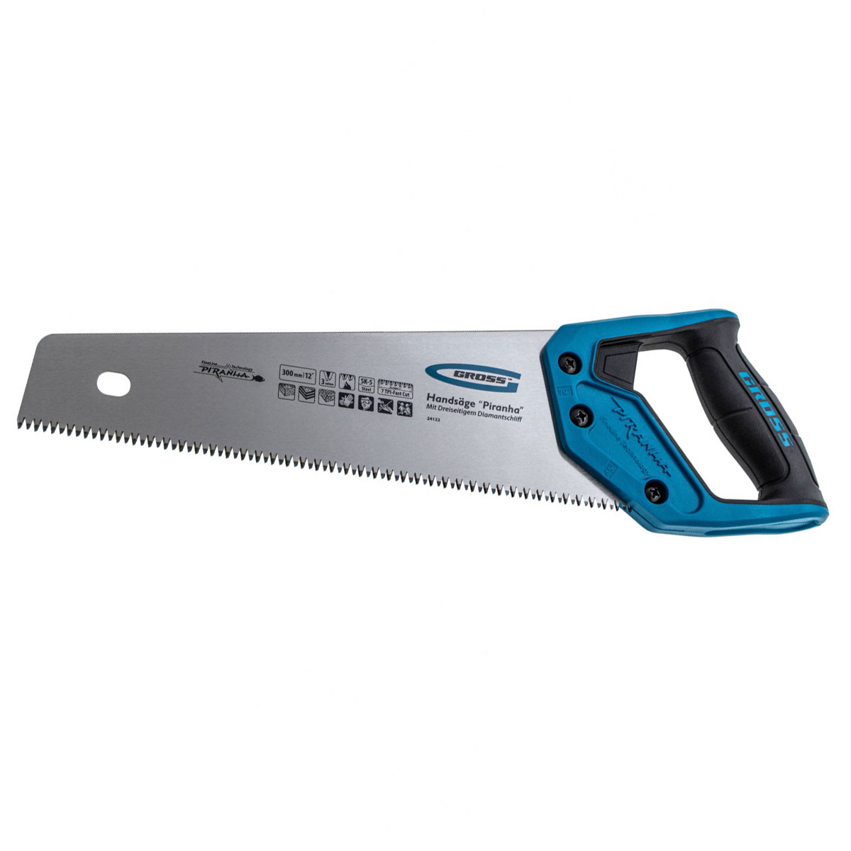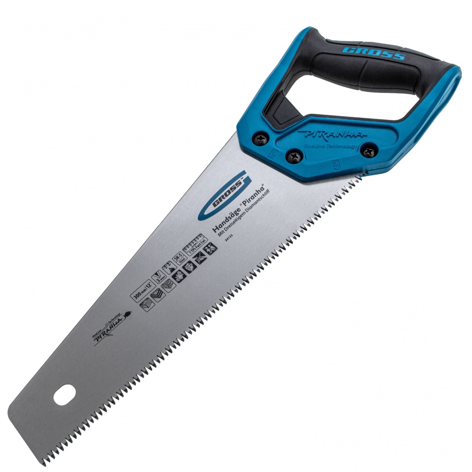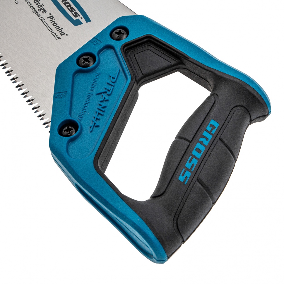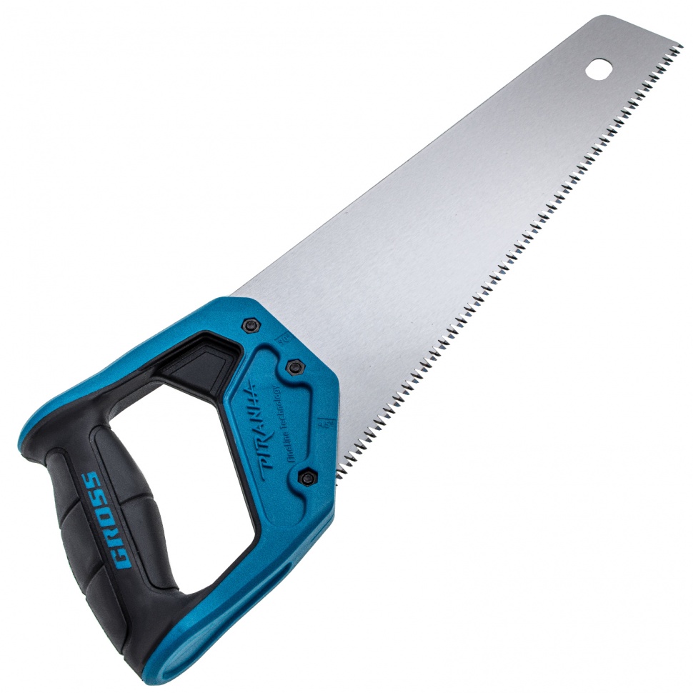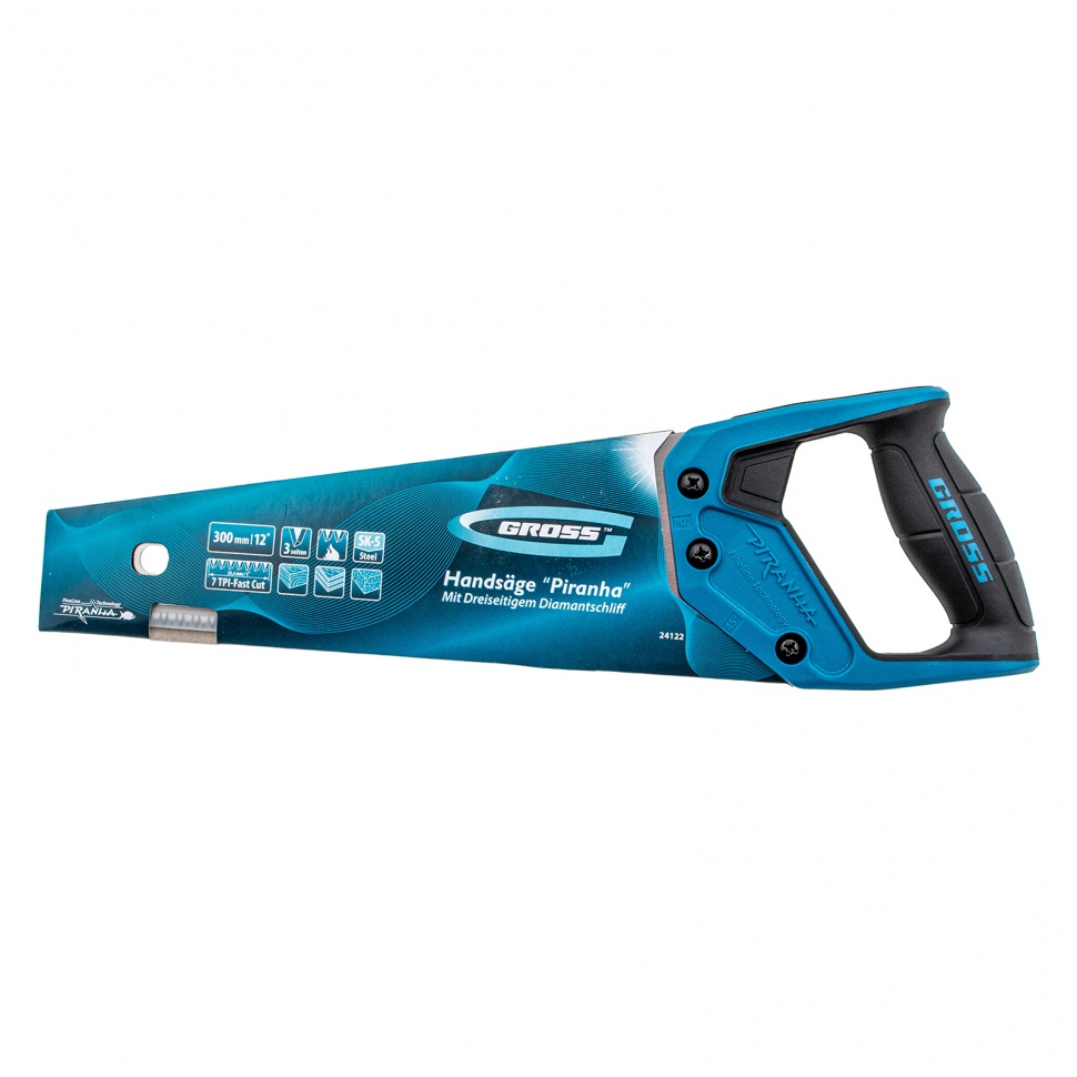 Ножовка по дереву Gross PIRANHA 24122 с полотном длиной 300 мм, калеными зубьями с 3D-заточкой и шагом 7 TPI, с 2-компонентной рукояткой, используется для распиливания древесины, МДФ, ДСП, ДВП, ламината, а также пенополистирола, полиуретана и других пластических материалов. Подходит для продольного и поперечного пиления. Зубья имеют универсальный шаг 7 TPI, поэтому ножовка подходит для решения широкого спектра задач. Трехгранная заточка зубьев обеспечивает максимальную производительность и высокое качество пиления. Ножовка предназначена для столярных и плотницких работ, пригодится во время ремонта и будет полезна в быту.ПреимуществаПолотно изготовлено из японской стали SK-5, обладающей высокими прочностными характеристиками.Зубья закалены токами высокой частоты, что обеспечивает повышенную износостойкость рабочей части.Закалка зубьев на 2/3 высоты уменьшает вероятность их слома при обработке древесины твердых пород.На полотно нанесено полимерное покрытие для защиты от коррозии.Рукоятка выполнена из ударопрочн