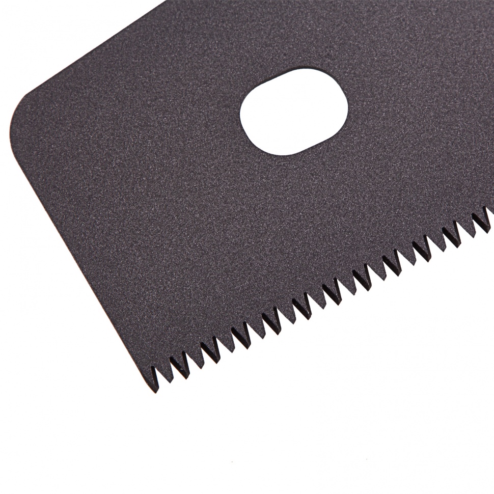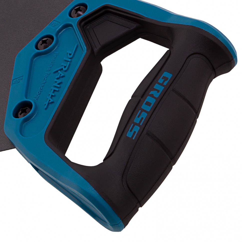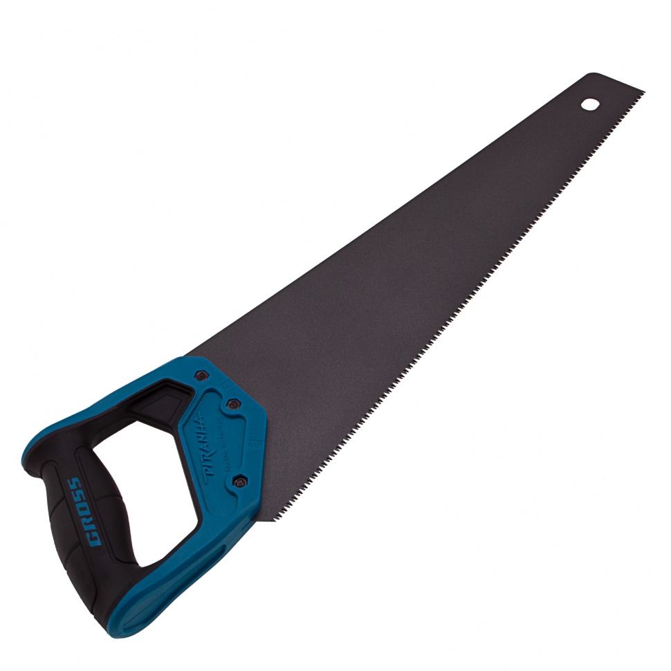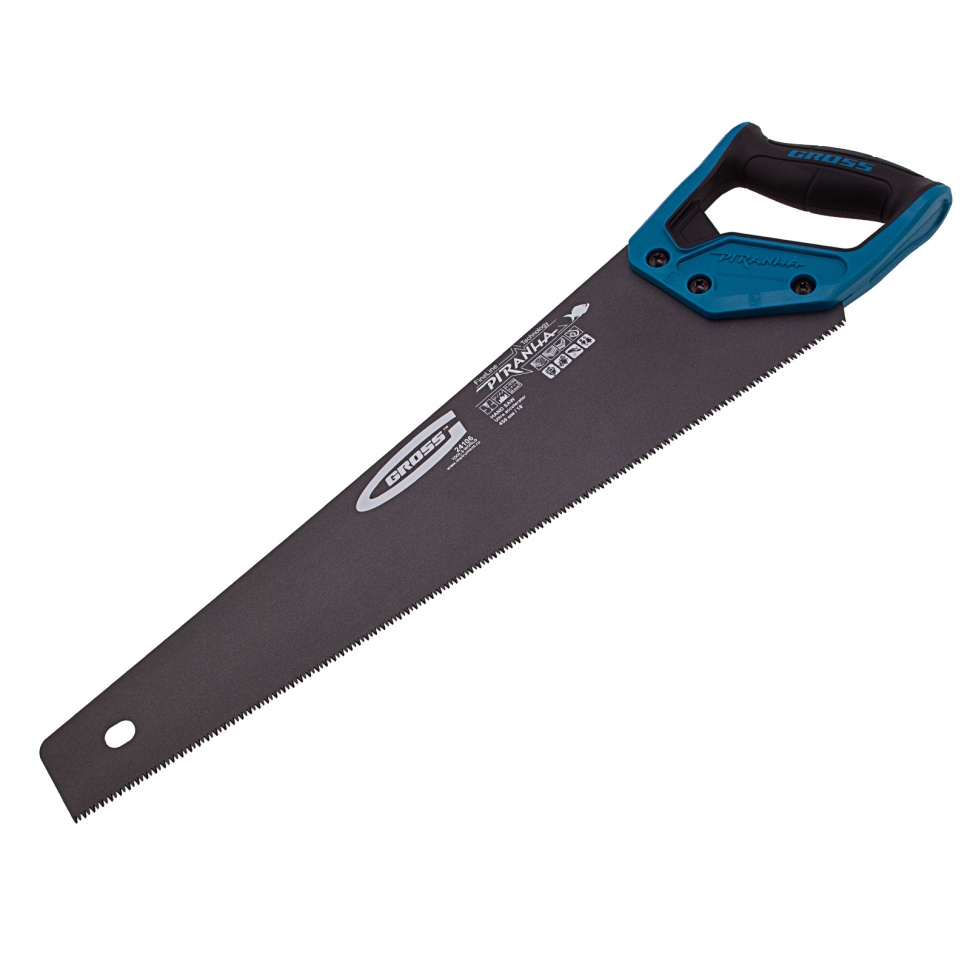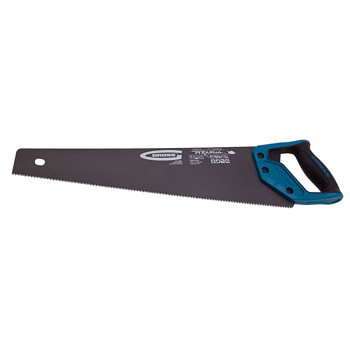 Ножовка по дереву Gross PIRANHA 24106 с полотном длиной 450 мм, калеными зубьями с 3D-заточкой и шагом 11-12 TPI, тефлоновым покрытием полотна и 2-компонентной рукояткой, используется для продольного и поперечного распиливания древесины различных пород, МДФ, ДСП, ДВП, ламината, а также пенополистирола, полиуретана и других синтетических материалов. Рабочая часть состоит из мелких зубьев с шагом 2-2,3 мм, что позволяет получить ровный и чистый рез. Трехгранная заточка зубьев увеличивает производительность инструмента без потери качества распиловки. Ножовка предназначена для столярных работ.ПреимуществаНадежность — полотно изготовлено из японской пружинной стали SK-5, а рукоятка — из ударопрочного ABS-пластика.Эффективная работа — зубья прошли закалку токами высокой частоты, поэтому рабочая кромка долго сохраняет режущие свойства.Прочность — основание зубьев не закалено на максимум, за счет чего снижается вероятность их слома при пилении твердых материалов или попадании на металлический предмет.Долговечность —