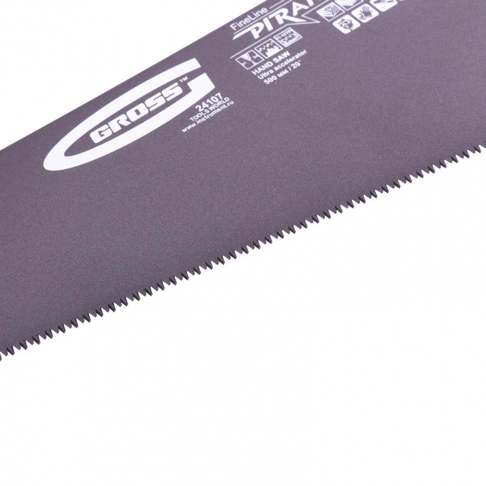 Ножовка по дереву Gross PIRANHA 24107 с полотном длиной 500 мм, калеными зубьями с 3D-заточкой и шагом 11-12 TPI, тефлоновым покрытием полотна и 2-компонентной рукояткой, используется для продольного и поперечного распиливания древесины различных пород, МДФ, ДСП, ДВП, ламината, а также пенополистирола, полиуретана и других синтетических материалов. Рабочая часть состоит из мелких зубьев с шагом 2-2,3 мм, что позволяет получить ровный и чистый рез. Трехгранная заточка зубьев увеличивает производительность инструмента без потери качества распиловки. Ножовка предназначена для столярных работ.ПреимуществаПолотно изготовлено из японской пружинной стали SK-5, поэтому характеризуется высокой прочностью и устойчивостью к нагрузкам.Зубья прошли закалку токами высокой частоты и устойчивы к износу, поэтому рабочая кромка долго сохраняет режущие свойства.Поскольку основание зубьев не закалено на максимум, снижается вероятность их слома при пилении твердых материалов или попадании на металлический предмет.На поверхность п