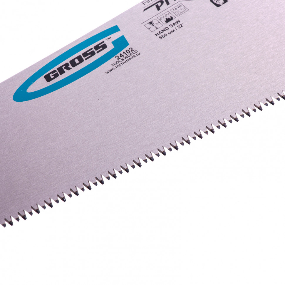 Ножовка по дереву Gross PIRANHA 24102 с полотном длиной 550 мм, калеными зубьями с 3D-заточкой и шагом 7-8 TPI, 2-компонентной рукояткой, используется для распиливания древесины, МДФ, ДСП, ДВП, ламината, а также пенополистирола, полиуретана и других пластических материалов. Подходит для продольного и поперечного пиления. Зубья имеют универсальный шаг 7-8 TPI, поэтому ножовка подходит для решения широкого спектра задач. Трехгранная заточка зубьев обеспечивает максимальную производительность и высокое качество пиления. Ножовка предназначена для столярных и плотницких работ, пригодится во время ремонта и будет полезна в быту.ПреимуществаПолотно изготовлено из японской стали SK-5, обладающей высокими прочностными характеристиками.Зубья закалены токами высокой частоты, что обеспечивает повышенную износостойкость рабочей части.Закалка зубьев на 2/3 высоты уменьшает вероятность их слома при обработке древесины твердых пород.На полотно нанесено полимерное покрытие для защиты от коррозии.Рукоятка выполнена из ударопро