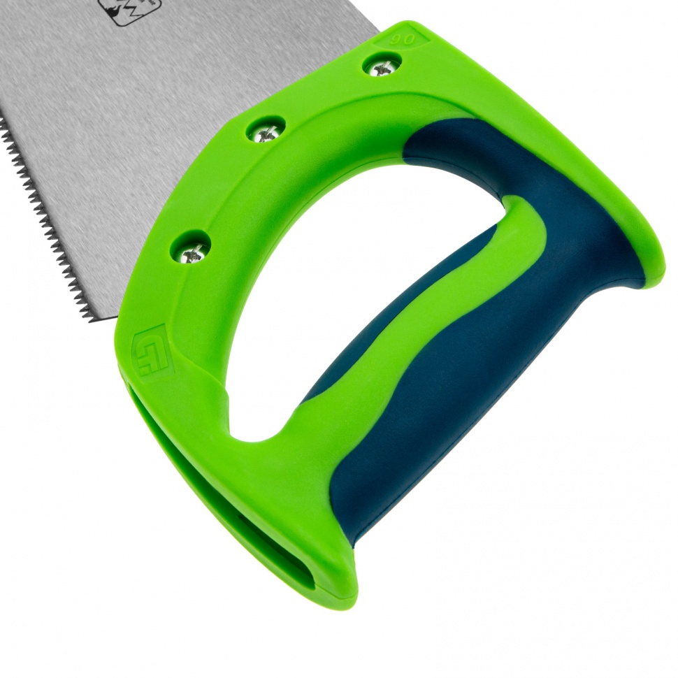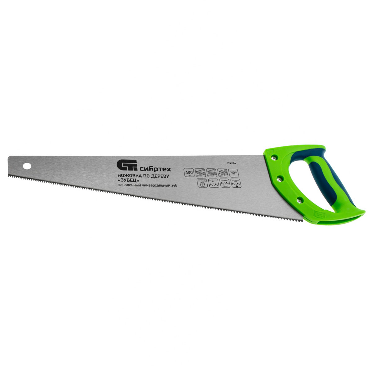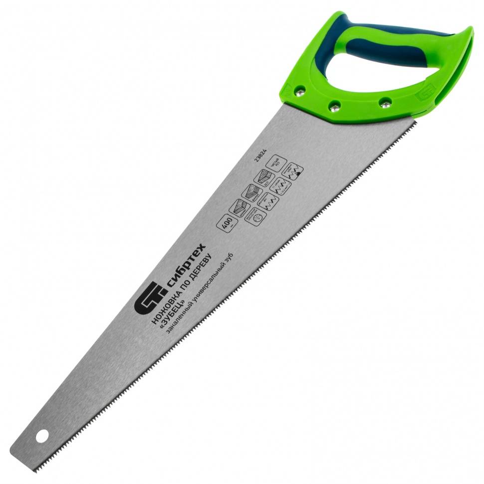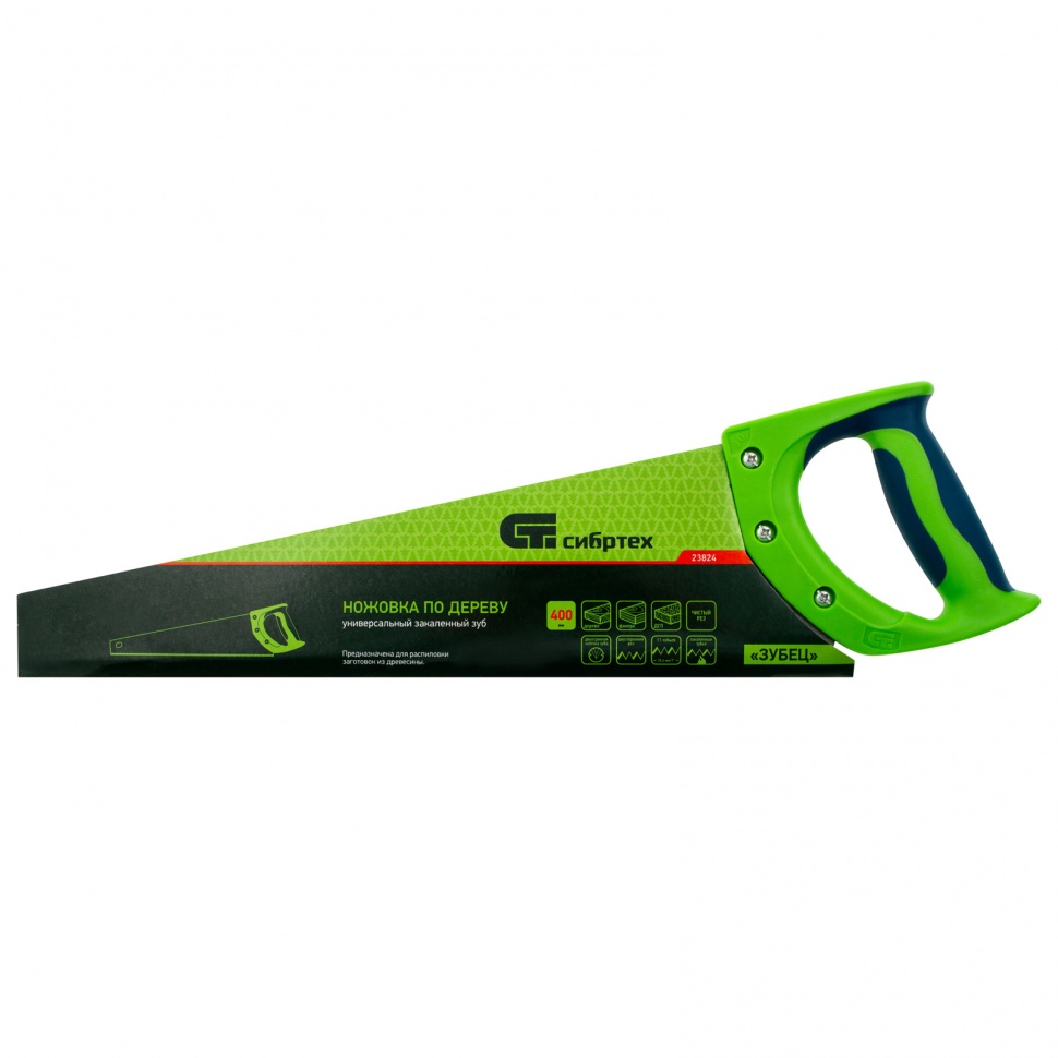 Ножовка по дереву Сибртех «Зубец» 23824 с полотном длиной 400 мм, калеными зубьями с 2D-заточкой и шагом 11 TPI, 2-компонентной рукояткой, используется для распиливания заготовок из древесины, фанеры и ДСП. Рабочая часть, содержащая 11 зубьев на дюйм, обеспечивает чистый двусторонний рез. Режущую кромку можно перетачивать. Ножовка будет полезна столярам, плотникам и домашним мастерам.ПреимуществаПолотно изготовлено из пружинной стали 65Mn, поэтому выдерживает значительные нагрузки.Зубья прошли закалку, что обеспечивает инструменту высокий ресурс работоспособности.Поверхность полотна покрыта лаком, защищающим ее от коррозии.Рукоятка из ударопрочного пластика прикреплена к полотну 3 винтами, что придает конструкции надежность.Резиновые вставки на рукоятке препятствуют выскальзыванию ее из ладони, что повышает комфортность работы.