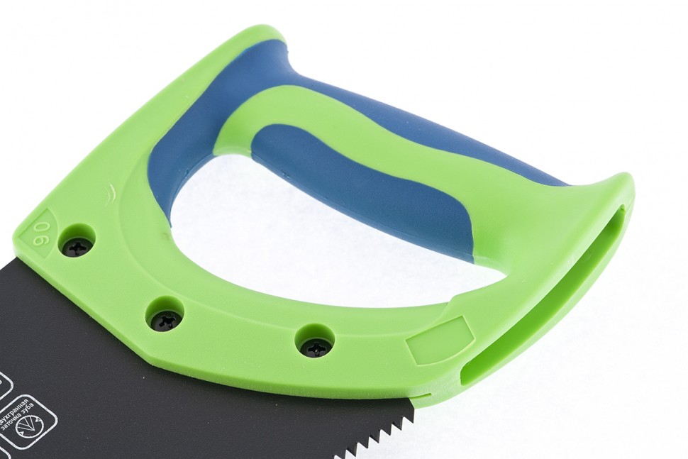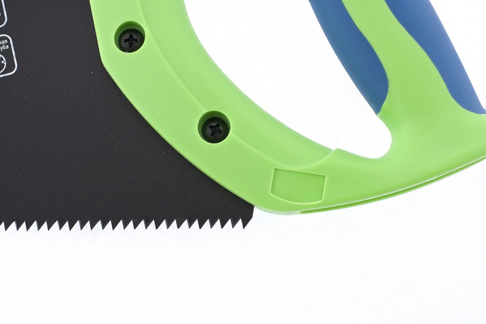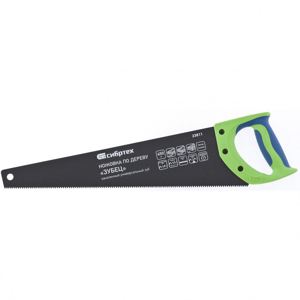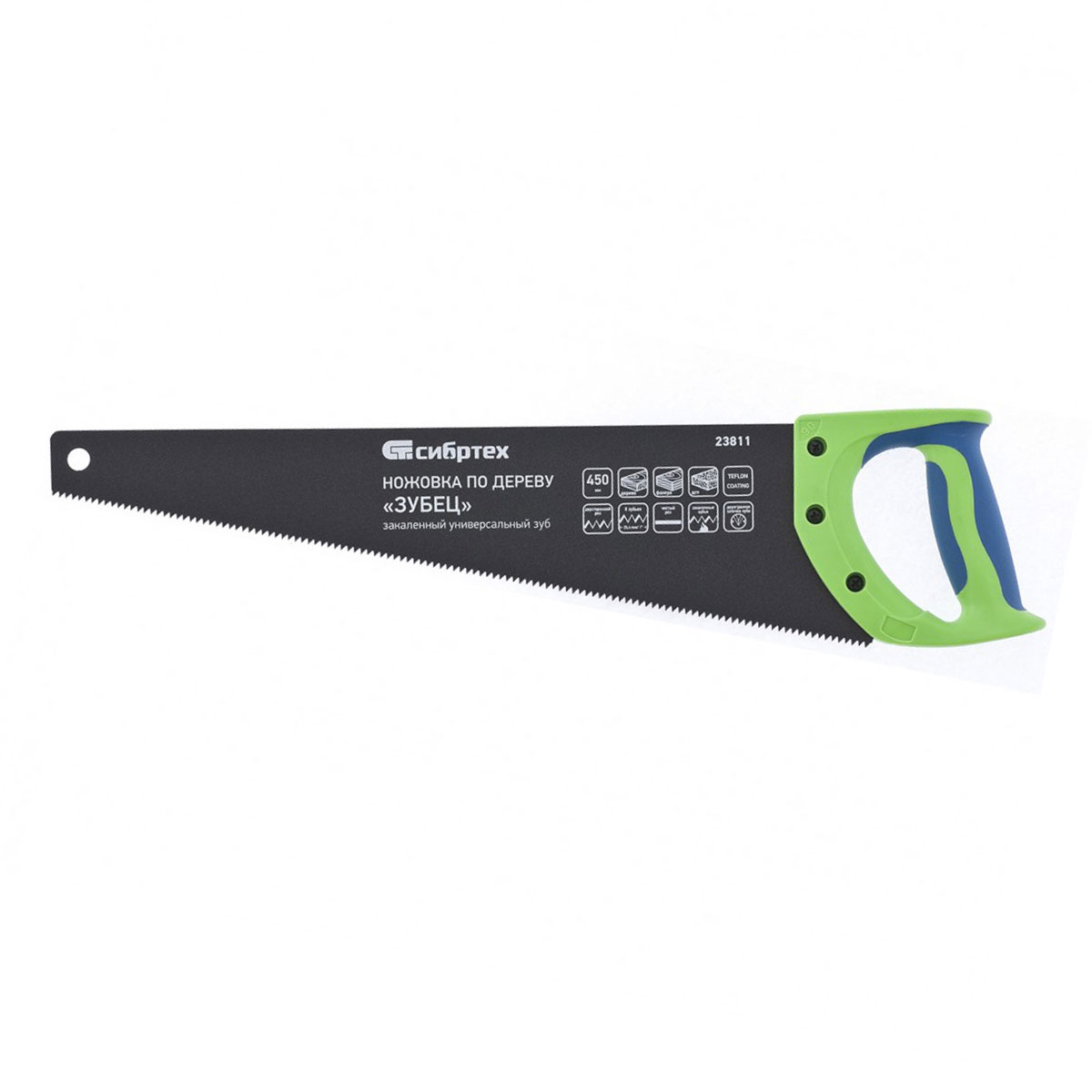 Ножовка по дереву Сибртех «Зубец» 23811 с полотном длиной 450 мм, калеными зубьями с 2D-заточкой и шагом 7-8 TPI, защитным покрытием и 2-компонентной рукояткой, используется для распиливания заготовок из древесины, фанеры и ДСП. Выполняет продольный и поперечный распил. Заточка зубьев 2D дает возможность пилить по направлению как вперед, так и назад. Зубья с универсальным шагом 7-8 TPI обеспечивают оптимальную скорость и качество реза. Если режущая кромка затупится, ее можно будет заточить. Ножовка будет полезна в столярной мастерской, а также дома или на даче.ПреимуществаПолотно из пружинной стали 65 Mn характеризуется высокой упругостью и прочностью.Рабочая кромка с закаленными зубьями долго сохраняет режущие свойства.Поверхность с тефлоновым покрытием не подвержена коррозии.Тефлоновое покрытие уменьшает трение во время пиления, что увеличивает скорость работы.Зафиксированная 3 винтами рукоятка крепко держится на полотне.Эргономичная рукоятка из ударопрочного пластика с резиновыми вставками снижает нагрузку