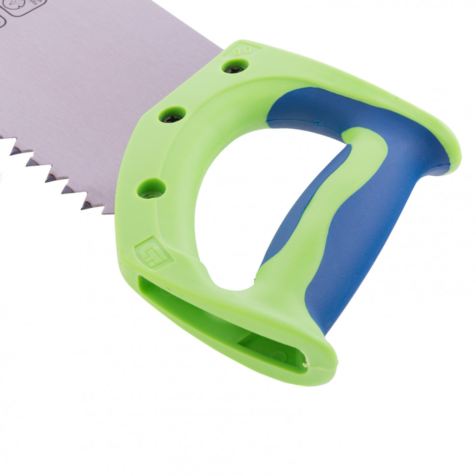 Ножовка по дереву Сибртех «Зубец» 23822 с полотном длиной 500 м, калеными зубьями с шагом 10 мм и 2D-заточкой, 2-компонентной рукояткой, используется для продольного и поперечного пиления древесины и ДСП. Рабочая кромка с шагом зубьев 10 мм обеспечивает быстрый рез. Зубья имеют 2D-заточку, благодаря чему ножовкой можно пилить в направлении как от себя, так и на себя. Возможна заточка режущей части. Ножовка применяется для выполнения плотницких работ, пригодится также и в быту.ПреимуществаПолотно изготовлено из легированной стали 65Mn, чем обусловлена его прочность и устойчивость к деформациям.Зубья ножовки закалены, что обеспечивает ей высокий ресурс работоспособности.Поверхность полотна покрыта лаком для защиты от коррозии.Рукоятка закреплена на полотне 3 винтами, поэтому не соскочит во время работы.Материал двухкомпонентной рукоятки — ударопрочный ABS-пластик, обеспечивающий надежность инструмента.Эргономичная рукоятка удобно лежит в руке, что повышает комфортность работы.