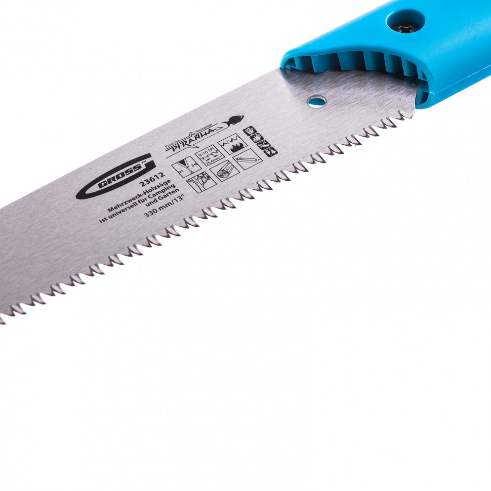 Универсальная пила по дереву Gross PIRANHA 23612 с полотном длиной 330 мм, калеными зубьями с шагом 9-10 TPI и 3D-заточкой, с 2-компонентной рукояткой, используется во время работ в саду и кемпинге. С ее помощью можно обрезать сучья или заготовить материал для растопки. Также пила подходит для распиловки фанеры, ДВП, ПВХ. Выполняет продольный и поперечный распил. Зубья с шагом 9-10 TPI и трехгранной заточкой обеспечивают высокую производительность инструмента. Благодаря заточке зубьев характеристики режущей кромки соответствуют всем международным стандартам. Пила комплектуется пластиковым пеналом, что исключает риск получения травмы во время хранения или транспортировки инструмента.ПреимуществаПолотно из высококачественной японской стали SK-5 твердостью 48-52 HRC характеризуется прочностью и износостойкостью.Прошедшие закалку зубья твердостью 64-66 HRC долго сохраняют остроту.Менее закаленные основания зубьев обеспечивают их устойчивость к слому при распиловке древесины твердых пород.Защитное лаковое покрытие