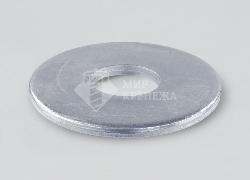 Шайба увеличенного размера используется в соединениях где необходимо защитить тонкостенные материалы за счет распределения давления на большую площадь. Покрытие из цинка защищает изделия от воздействия влаги.