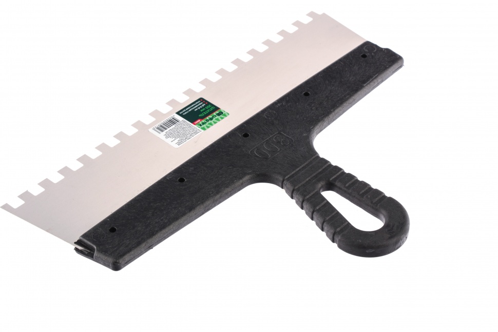 Шпатель Сибртех 85476 шириной 300 мм, из нержавеющей стали, с пластмассовой ручкой и зубьями 8 х 8 мм, применяется для равномерного нанесения клея при укладке мелкоформатной плитки, мозаики и т.д. Квадратные зубья облегчают нанесение клеевого состава, позволяя ровно и экономно распределять его по поверхности. Зубья размером 8 х 8 мм рассчитаны на плитку площадью 400-900 см2.