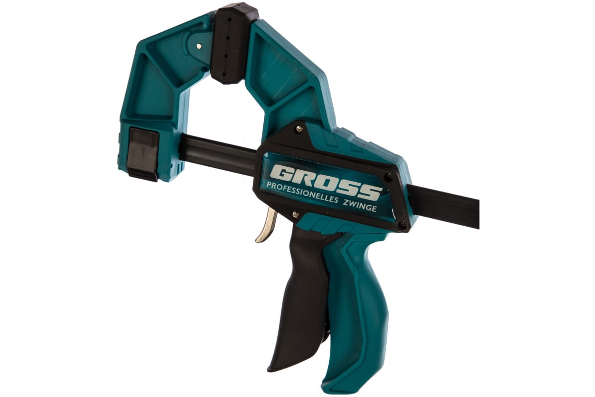 Реечная быстрозажимная струбцина Gross 20706 пистолетного типа, с пластиковым корпусом, с шириной зажима 600 мм, с пошаговым механизмом, используется для зажимания заготовок при выполнении столярных или монтажных работ. Удобна для фиксации деревянных деталей, т.к. пластиковые накладки на губках не повреждают их поверхность при сжатии. Пластинчатый механизм пошагово передвигает подвижную губку, постепенно зажимая обрабатываемый предмет. Курковый фиксатор удерживает ее в заданном положении. Инструмент рекомендован для профессионального использования.ПреимуществаКорпус и губки изготовлены из ударопрочного пластика, поэтому инструмент устойчив к высоким механическим нагрузкам.Шина изготовлена из углеродистой стали и обладает высокой прочностью на изгиб.Антикоррозионное покрытие шины обеспечивает защиту от ржавчины и продлевает срок службы струбцины.Опорную губку можно перемещать вдоль рейки, фиксируя зажимом, и переворачивать на ней, что позволяет использовать струбцину как распорный инструмент.Струбцина изготовл