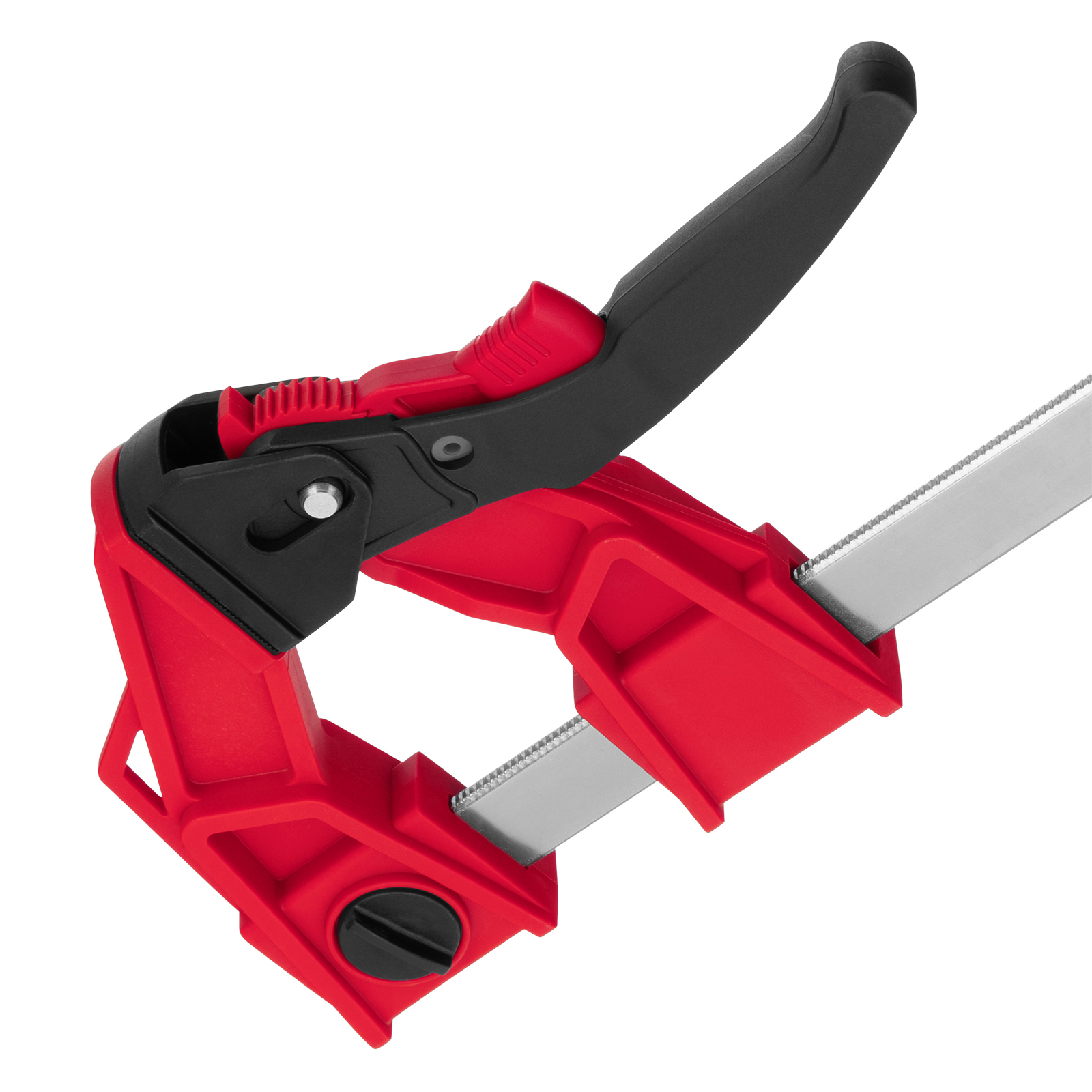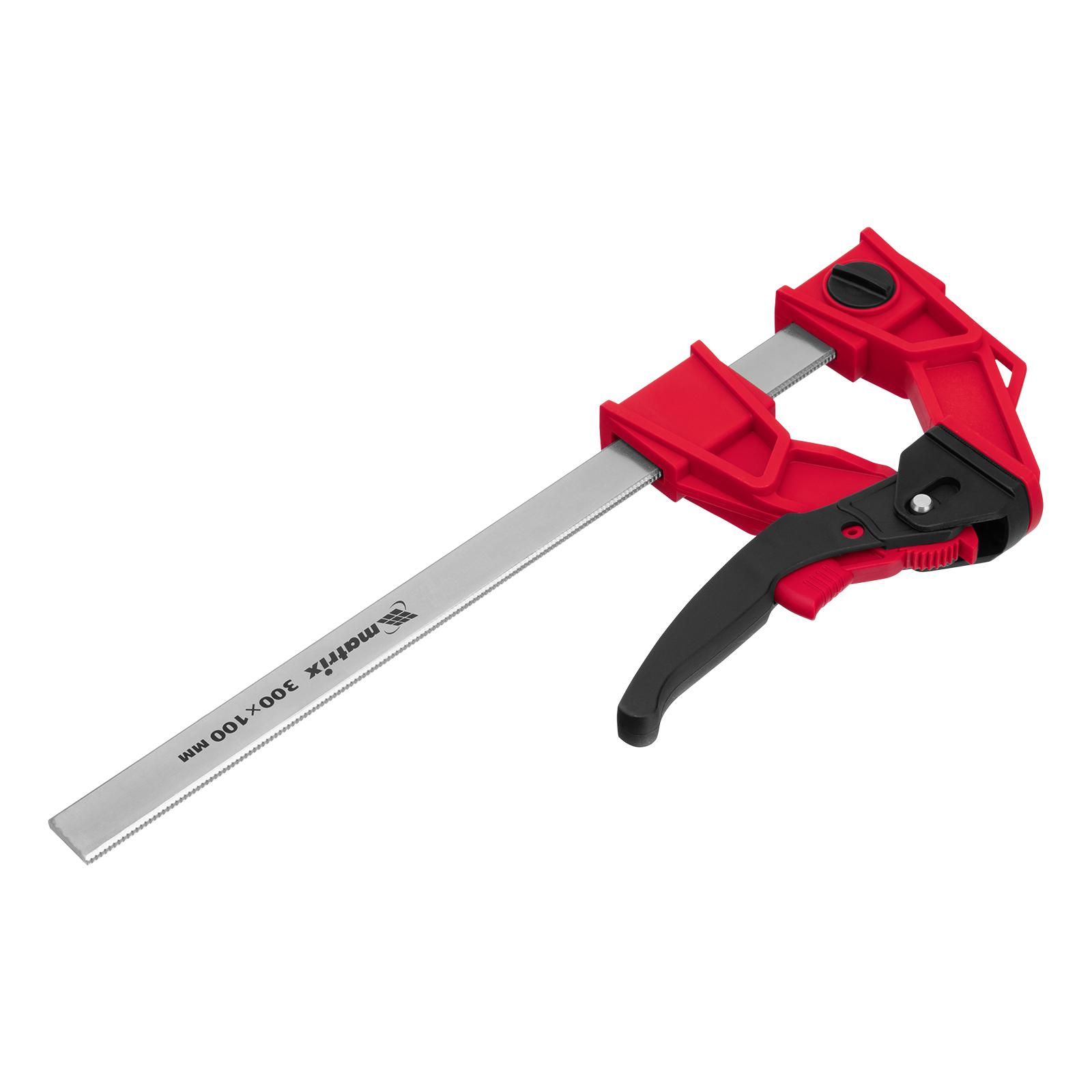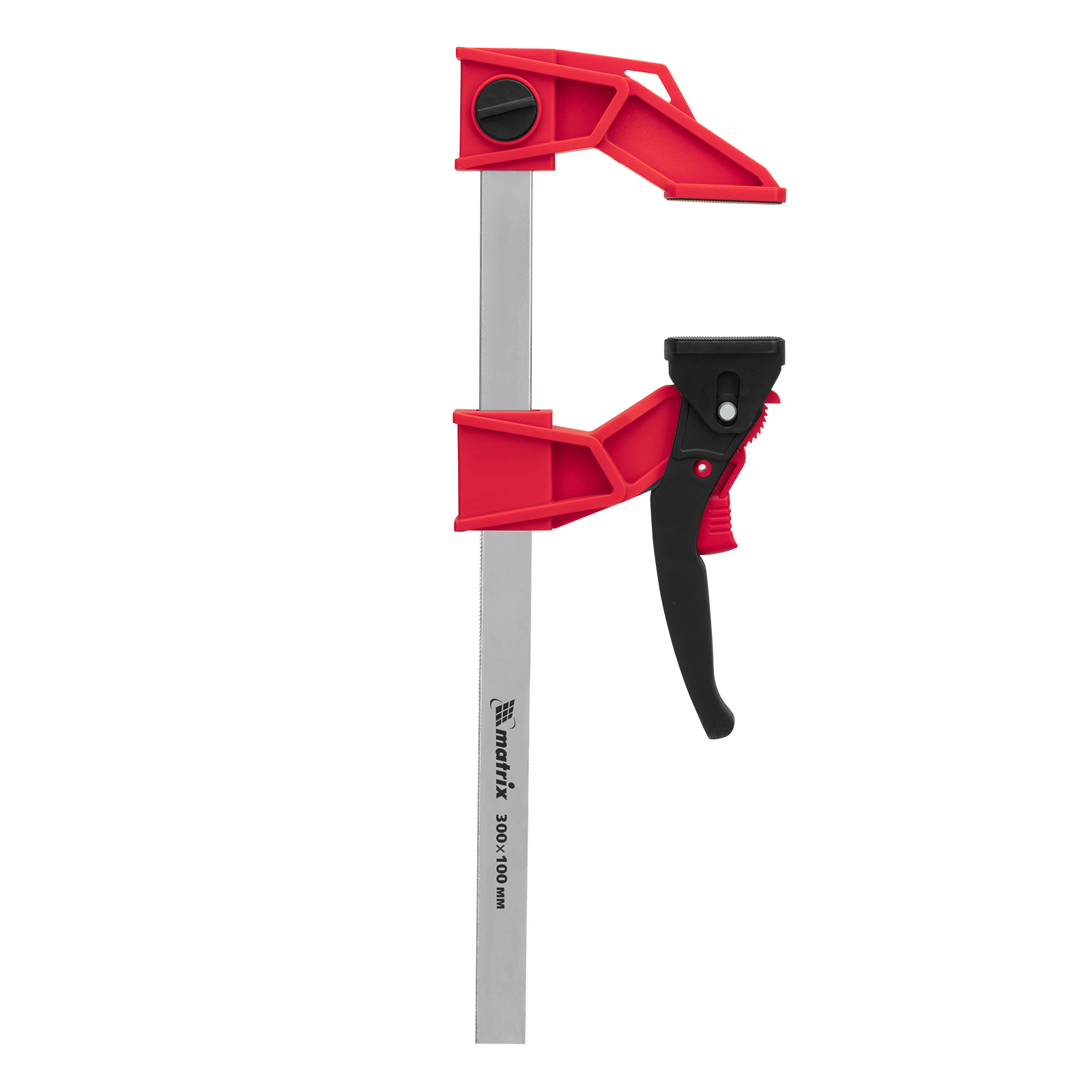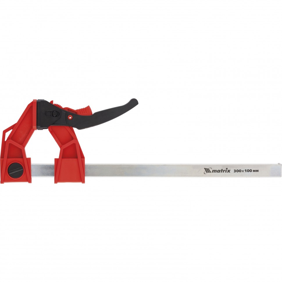 Реечная быстрозажимная струбцина Matrix 20728, 300 х 100 х 456 мм, со штангой сечением 5 х 22 мм, с усиленным пластиковым корпусом и рычажным храповым механизмом, предназначена для кратковременной фиксации деталей с целью их склеивания, а также опиливания, сверления и другой обработки. Рычажный храповый механизм позволяет перемещать подвижную губку на небольшое расстояние, сжимая заготовку со значительным усилием. Струбцина пригодится в столярной мастерской, а также будет полезна в быту.ПреимуществаСтальная рейка и усиленный корпус из ударопрочного пластика выдерживают значительные нагрузки при сжатии.Съемную неподвижную губку можно перевернуть на рейке, превратив струбцину в распорный инструмент.Пластиковые губки не повреждают поверхность заготовок, что важно для работы с древесиной.