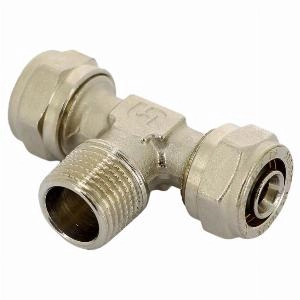 Фитинг обжимной – тройник с переходом на наружную резьбу служит для присоединения металлополимерных (металлопластиковых) трубопроводов. Резьба фитинга – наружная трубная