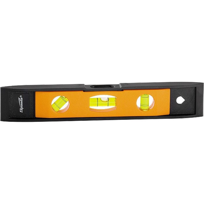 Пластмассовый уровень Sparta «Торпедо» (II) 346055 длиной 225 мм, магнитный, с 3 глазками, используется для контроля соответствия поверхностей вертикальной и горизонтальной плоскостям и углу 45 градусов. Благодаря компактности и небольшой длине инструмент удобен для работы в труднодоступных местах.Для определения отклонения вертикали 90 градусов необходимо использовать пузырьковую ампулу только в верхнем положении уровня. Только базовая поверхность является рабочей (противоположная ампуле 180 градусов).ПреимуществаУровень выполнен из прочной пластмассы и рассчитан на долгую службу.В корпус встроен магнит для фиксации инструмента на металлических поверхностях.Отверстие в корпусе позволяет организовать подвесное хранение.