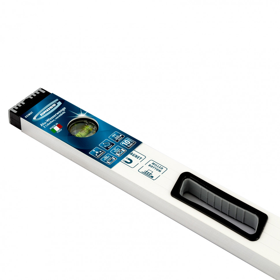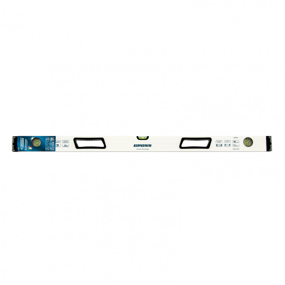 Усиленный алюминиевый уровень Gross 34372 длиной 1000 мм, с рукоятками и 3 глазками, фрезерованный, магнитный, — это простой и универсальный инструмент для проверки горизонтали и вертикали. Благодаря качественному исполнению инструмент обеспечивает высокую точность работы.ПреимуществаПрочность — корпус инструмента изготовлен из алюминиевого профиля.Встроенные магниты — уровень удобно использовать при работе с металлическими поверхностями.Комфортная работа — для удобного захвата инструмента в корпусе предусмотрены рукоятки.Эффективная работа — электронная калибровка глазков уровня и фрезерованная рабочая поверхность повышают точность проводимых измерений.Надежность — обрезиненные торцевые заглушки амортизируют удары при падении инструмента с небольшой высоты, что снижает риск его повреждения.Для определения отклонения вертикали 90 градусов необходимо использовать пузырьковую ампулу только в верхнем положении уровня. Только базовая поверхность является рабочей (противоположная ампуле 180 градусов).