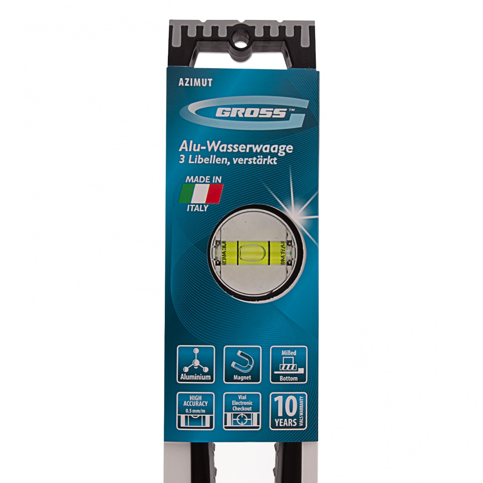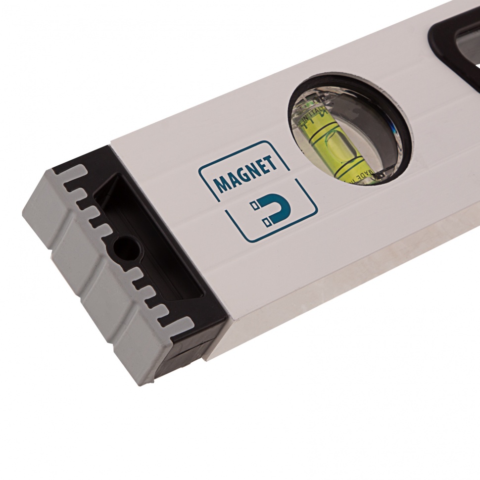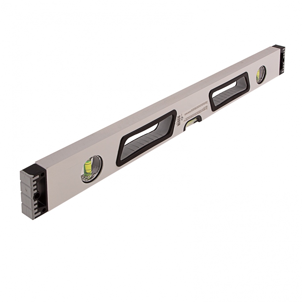 Усиленный алюминиевый уровень Gross 34370 длиной 600 мм, с рукоятками и 3 глазками, фрезерованный, магнитный, — это простой и универсальный инструмент для проверки горизонтали и вертикали. Благодаря качественному исполнению инструмент обеспечивает высокую точность работы.ПреимуществаПрочность — корпус инструмента изготовлен из алюминиевого профиля.Встроенные магниты — уровень удобно использовать при работе с металлическими поверхностями.Комфортная работа — для удобного захвата инструмента в корпусе предусмотрены рукоятки.Эффективная работа — электронная калибровка глазков уровня и фрезерованная рабочая поверхность повышают точность проводимых измерений.Надежность — обрезиненные торцевые заглушки амортизируют удары при падении инструмента с небольшой высоты, что снижает риск его повреждения.Для определения отклонения вертикали 90 градусов необходимо использовать пузырьковую ампулу только в верхнем положении уровня. Только базовая поверхность является рабочей (противоположная ампуле 180 градусов).