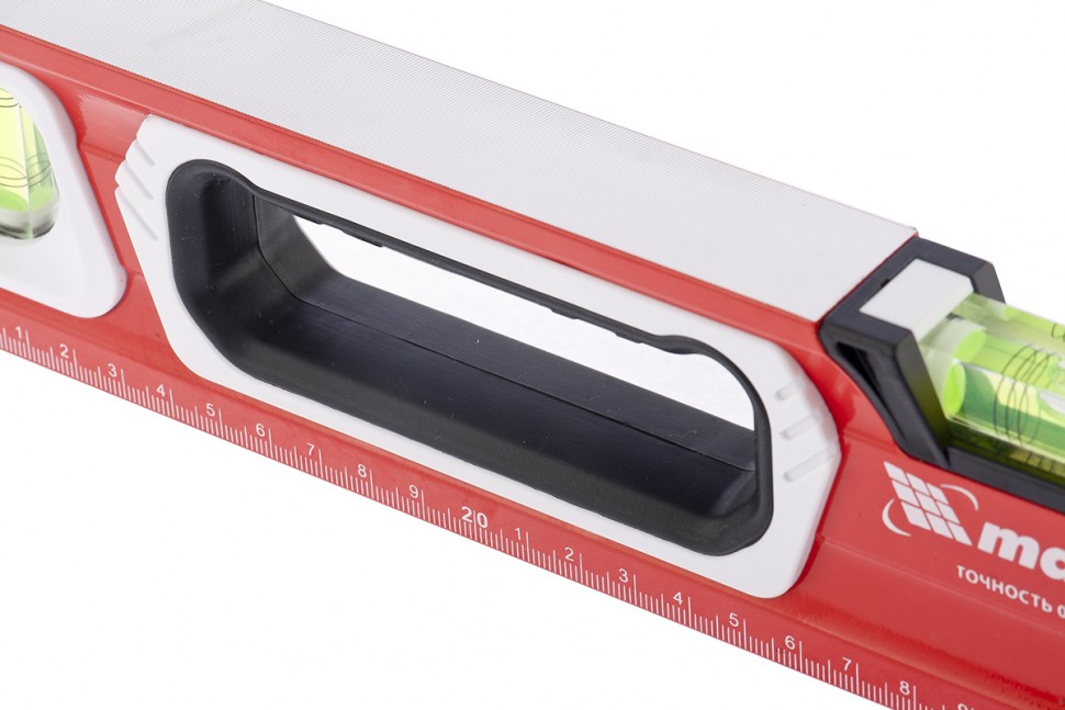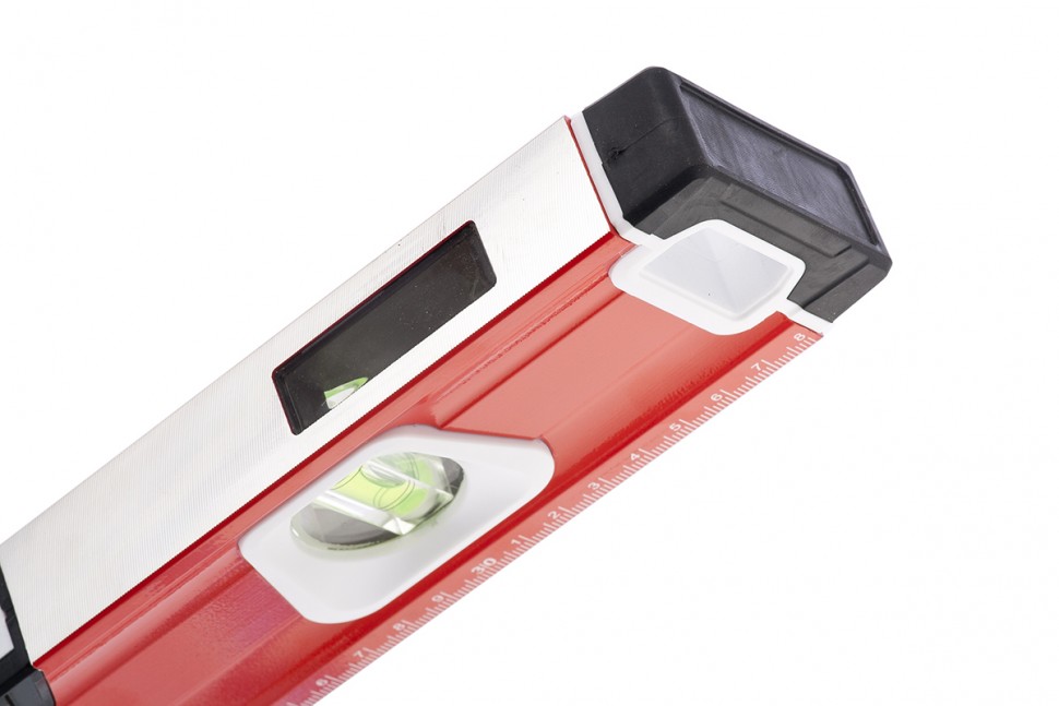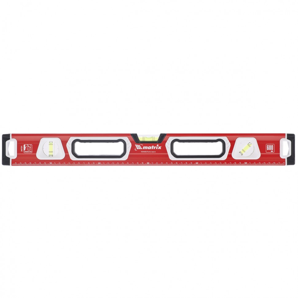 Алюминиевый уровень Matrix 34732 длиной 800 мм, магнитный, фрезерованный, с двухкомпонентными рукоятками, 3 глазками и 1 зеркальным отражателем, относится к категории измерительных инструментов. Служит для контроля отклонений поверхностей от горизонтали, вертикали и угла 45 градусов. Инструмент понадобится при осуществлении работ, требующих высокой точности.Для определения отклонения вертикали 90 градусов необходимо использовать пузырьковую ампулу только в верхнем положении уровня. Только базовая поверхность является рабочей (противоположная ампуле 180 градусов).ПреимуществаКорпус выполнен из алюминиевого профиля — легкого и прочного материала, не подверженного образованию коррозии.Электронная калибровка глазков уровня и фрезеровка рабочей грани позволили снизить погрешность измерений до 0,5 мм/м.В корпусе предусмотрены рукоятки для удобного захвата инструмента и 2 отверстия для организации подвесного хранения.Измерительная шкала на корпусе позволяет использовать инструмент в качестве линейки.