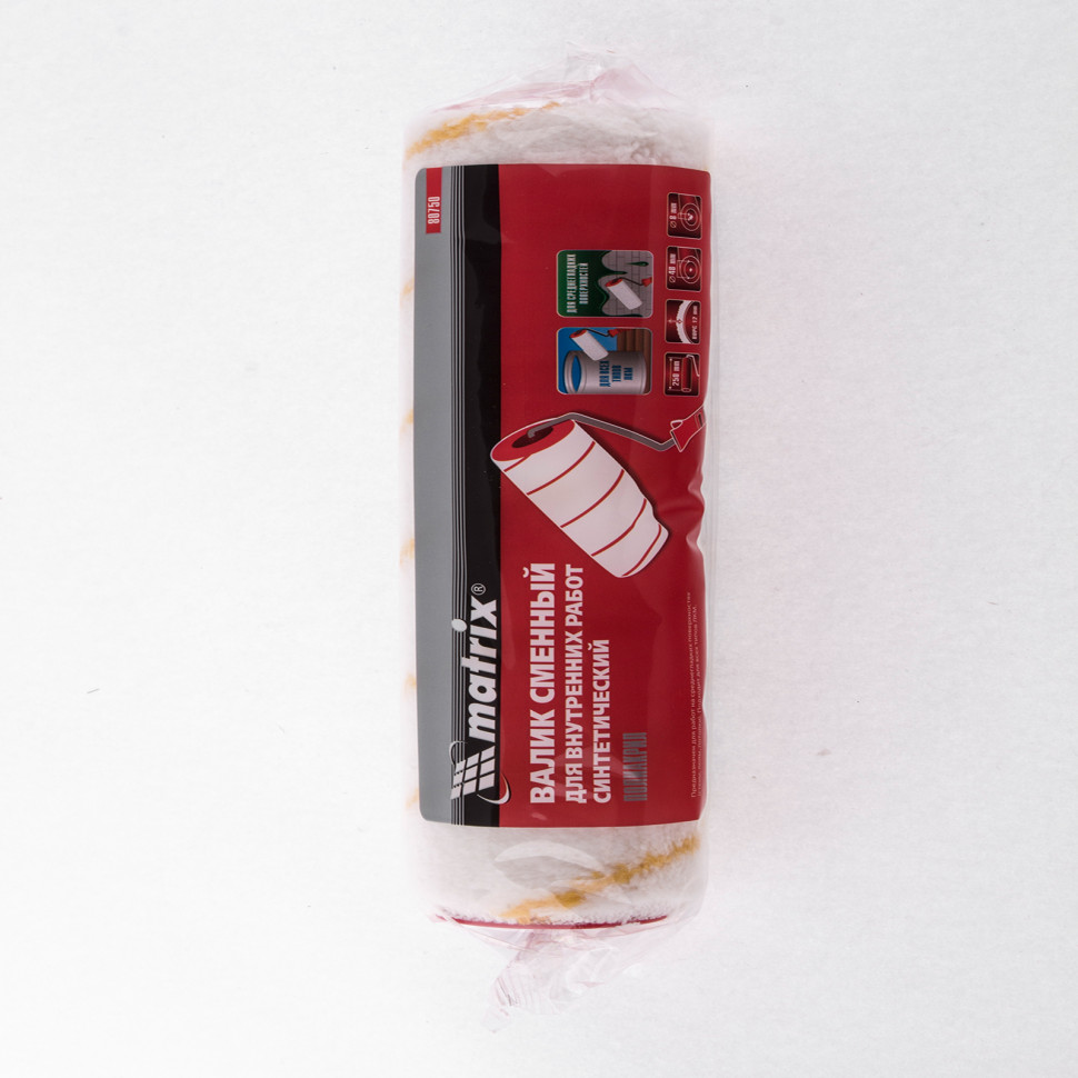 Сменный синтетический валик Matrix 80750 шириной 250 мм и диаметром 48 мм, под бюгель диаметром 8 мм, с ворсом 12 мм из полиакрила, оптимален для проведения малярных работ внутри помещений. Шубка с ворсом длиной 12 мм подходит для окрашивания средне-гладких поверхностей: полов, стен и потолков. Полиакрил в составе обеспечивает высокое качество работ с любыми типами ЛКМ, делает шубку износоустойчивой и формостойкой.ПреимуществаТехнология Termofusion — шубка надежно зафиксирована на ролике и не деформируется при интенсивном использовании.Легкий монтаж — быстросъемная система крепления позволяет за несколько секунд снять валик или зафиксировать его на бюгеле.Аккуратная работа — на шубке нет шва, а ее края острижены, это обеспечивает отсутствие следов на окрашиваемой поверхности.Максимальная отдача лакокрасочных материалов — ролик свободно вращается на бюгеле без заеданий, обеспечивая комфортную работу.Ширина 250 мм — валик подходит для окрашивания больших поверхностей.